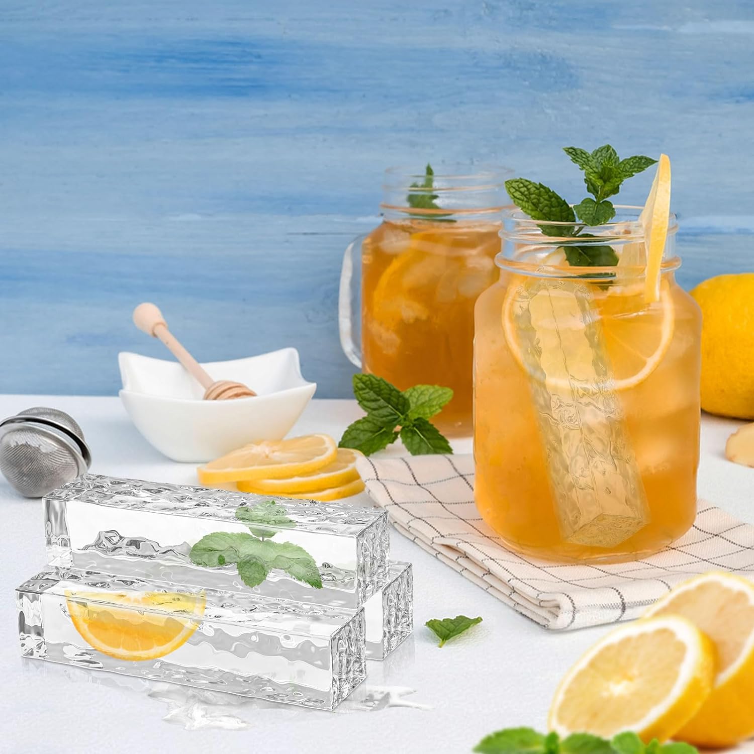 • Large cubes: use lemon wheel halves or segments so they sit flat and remain visible