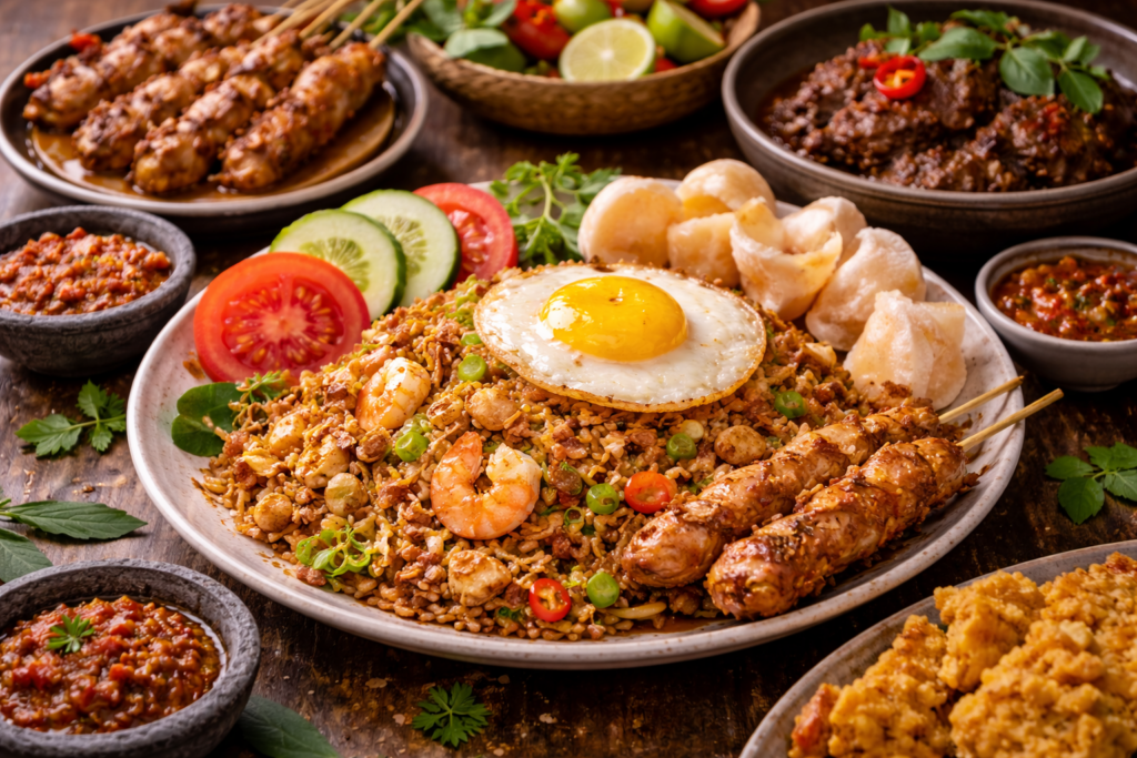Staples such as rice, coconut milk, peanuts, palm sugar, and tamarind create the signature balance of savory, spicy, sweet, and tangy flavors. Cooking methods frequently include slow braising, grilling, stir-frying, and deep frying, producing richly layered dishes like nasi goreng, satay, and rendang. The result is a cuisine celebrated for its deeply spiced sauces, complex aromatics, and comforting, communal style of eating.