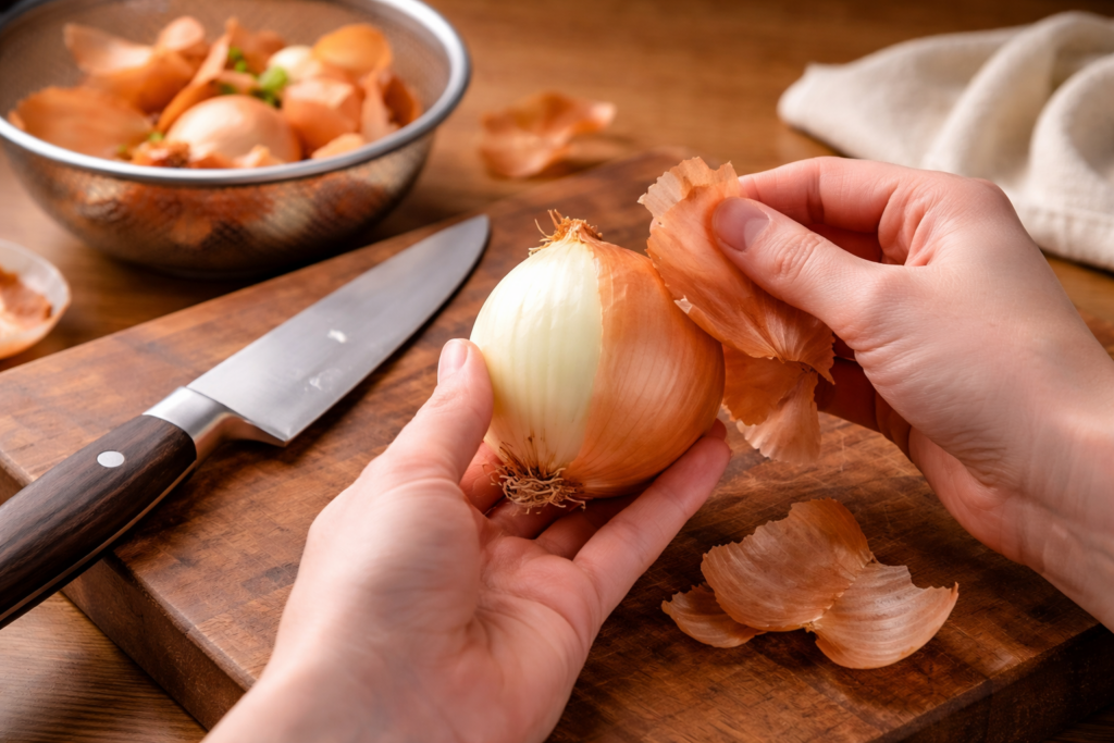 Before making a single cut, remove the papery outer skin of the onion. Once peeled, give the whole onion a quick rinse under cold water to remove any residual skin or debris, then dry it thoroughly with a paper towel. Starting with a clean, dry surface makes the onion easier to handle and keeps your knife from slipping.
