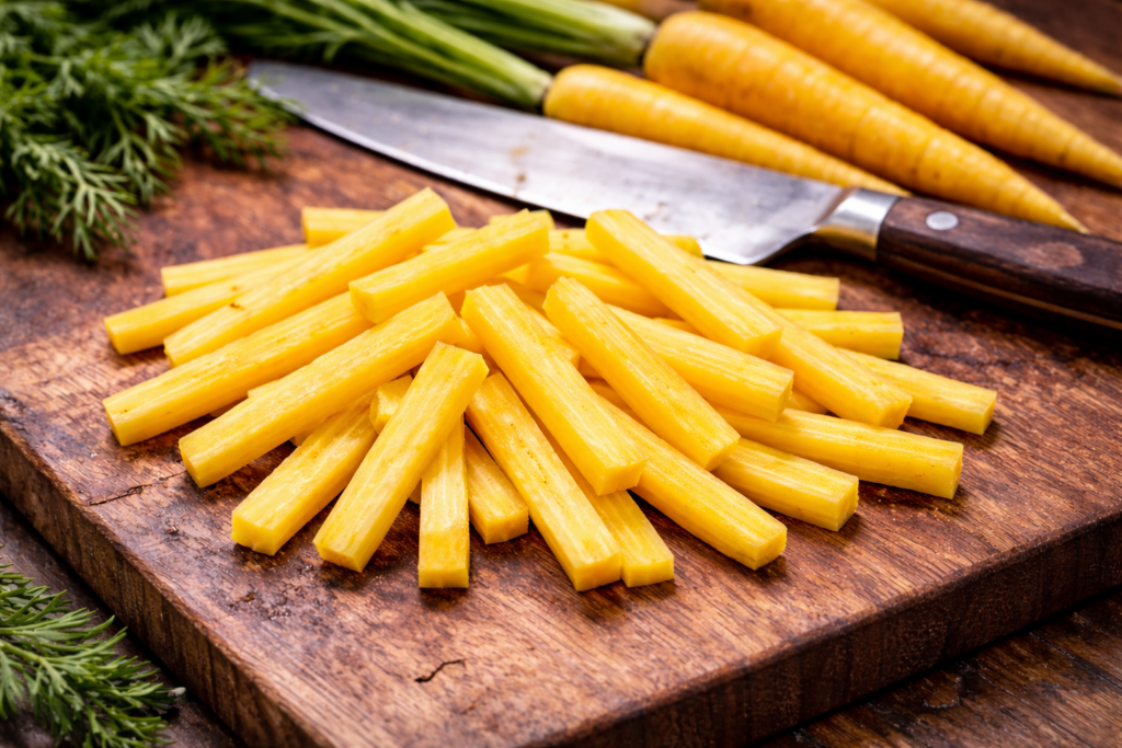 Uniform sticks, typically about 2–3 inches long and ¼–½ inch thick, create a clean, consistent cut that cooks at an even pace from end to end. That uniformity isn’t just visual—it ensures each piece responds to heat the same way, so you’re not dealing with a mix of overcooked edges and underdone centers. As they cook, the exterior develops color and light caramelization while the interior stays firm but tender, giving you a balanced texture throughout.