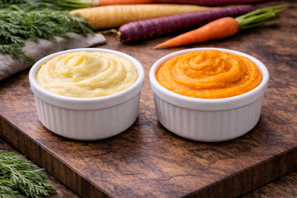 Cooked and blended in a food processor until smooth, carrot purée transforms the ingredient from something you can see into something that defines the dish. As the fibers break down, the natural sugars concentrate and the texture becomes soft, cohesive, and almost silky. What you’re left with is a base that carries both flavor and body, rather than a component that sits alongside everything else.