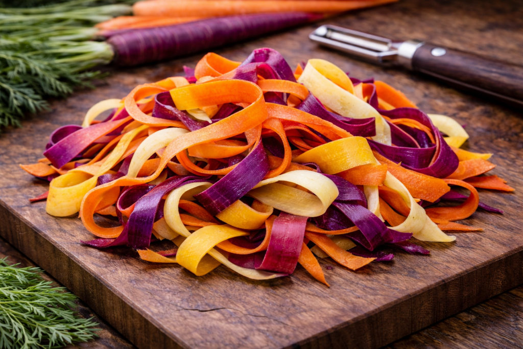 Wide, thin strips made with a vegetable peeler create ribbons that are flexible, delicate, and visually expressive. Because they’re sliced so thin, they don’t require much cooking—if any—and respond quickly to dressings, heat, or acid. Their texture is soft with just a slight bite, allowing them to drape and fold naturally, which brings a more refined, fluid quality to the dish.