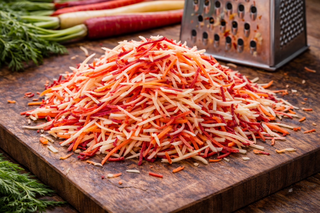 Shredded carrots are produced on the coarse grate (larger holes) side of a box grater, creating longer, thicker strands with more texture and presence than a fine grate. That added size gives them structure—they soften slightly as they’re dressed or cooked, but retain enough integrity to stay distinct. They absorb flavor well while still offering a gentle bite, striking a balance between tenderness and texture.