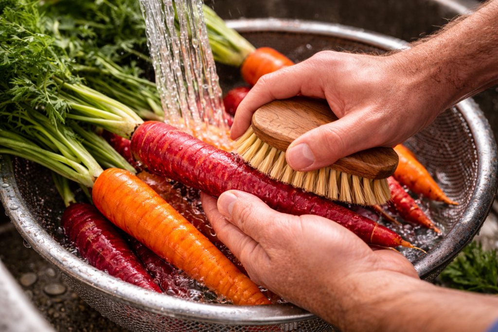 Carrots grow underground, and even when they look clean, there’s often a fine layer of grit still clinging to the surface, especially around the stem end and in any natural creases. A vinegar soak for 2-3 minutes, followed by a thorough scrub with a vegetable brush goes a long way in removing that residual earth, which can otherwise dull the flavor and texture of the final dish. Peeling is optional and depends on the application—leaving the skin on can add a bit of character and depth, while peeling creates a more refined finish—but either way, cleanliness matters more than appearance.