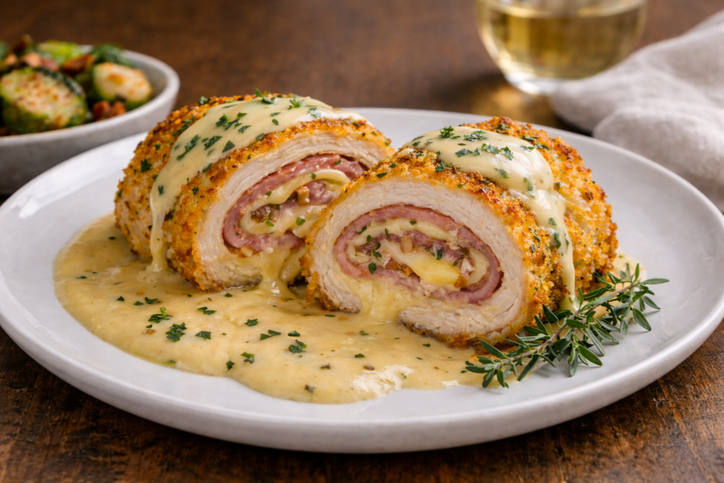 This version keeps the integrity of the original—tender chicken wrapped around ham and cheese, coated in crisp breadcrumbs—but leans further into its French roots with richer cheese, layered aromatics, and a few herb-forward upgrades that make it feel less cafeteria and more French café.