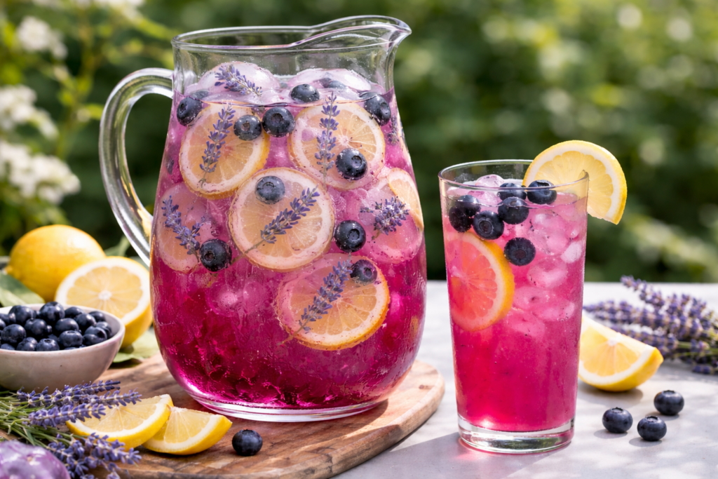 Blueberry Lavender Lemonade takes a familiar build and gives it more structure—tart lemon sharpened by a fruit-forward syrup and lifted with a subtle floral edge. The citrus stays bright and direct, while the blueberry adds body and a soft, rounded sweetness that keeps the drink from feeling thin. The lavender sits just behind it, not as a dominant flavor, but as a quiet lift that keeps everything clean and balanced.