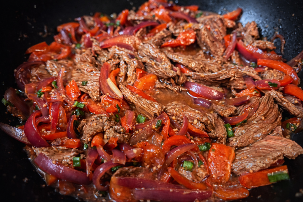 Lomo Saltado works because of contrast—high heat against fresh ingredients, savory depth balanced by brightness. The beef caramelizes quickly, the onions soften while still keeping their bite, and the tomatoes release just enough juice to bring everything together in a glossy, flavorful sauce.