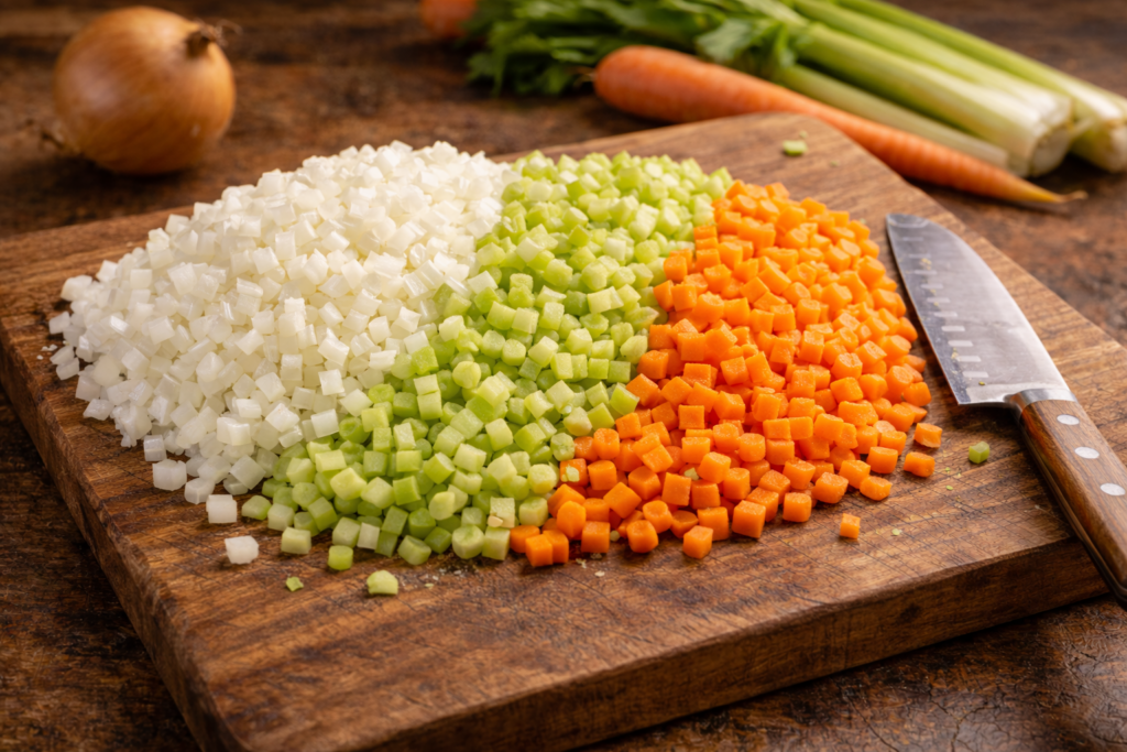 Mirepoix doesn’t require perfect knife work, but it does benefit from consistency. The size of the cut should reflect how it’s being used. Larger pieces make sense in stocks or broths where everything will be strained out later. Smaller dice work better when the mirepoix stays in the dish, softening into sauces, stews, or braises.